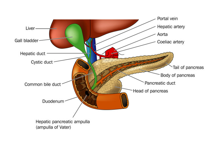 The head is the widest part of the organ nearest to the small intestine and is the most common site of pancreatic tumour growth. The body is the middle section and around 15% of cancers are found here. Finally, the tail is the thinnest part of the pancreas. Only 5% of pancreatic tumours are found here.